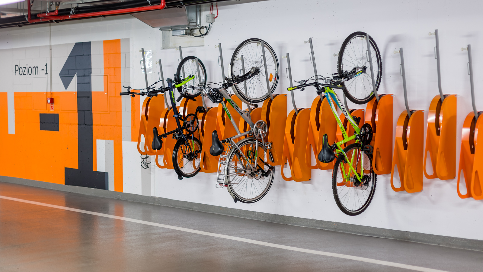 Szczególnie ważne w przypadku tych wieszaków jest odpowiednio szeroki rozstaw, tak aby swobodnie można było wprowadzić rower, nawet przy pełnym obłożeniu parkingu.